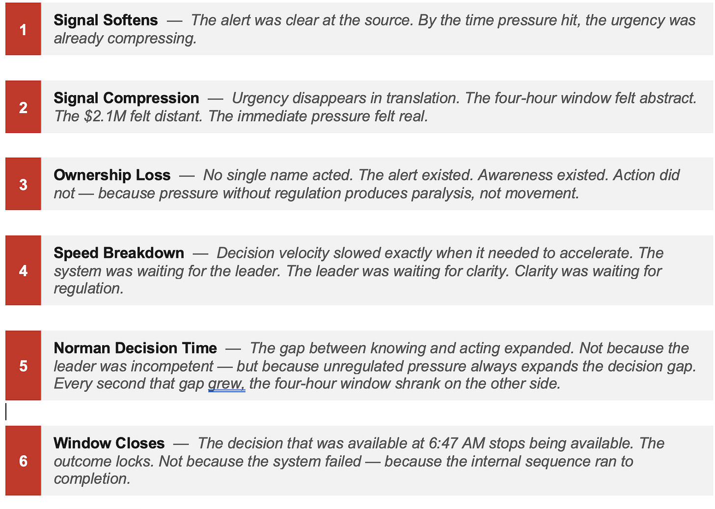 At 6:47 AM, pressure arrived with the alert. It rose in ninety seconds. In an unregulated leader, it exceeds the internal threshold — and Norman’s Law executes. The chain runs. Signal compresses. Ownership blurs. Decision gap expands. Window closes. The law does not care about intention, experience, or intelligence. It executes on the gap between pressure and regulation. Every time.