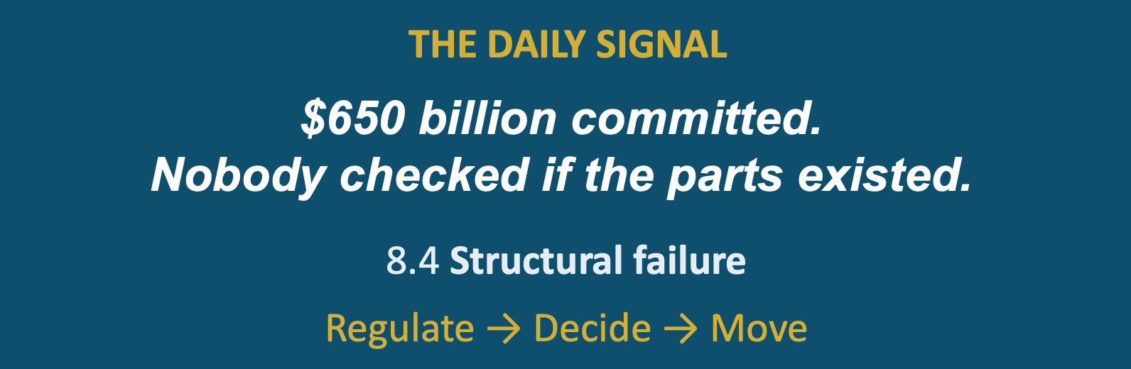 • What broke. Capital commitments were made at the announcement layer, not the execution layer. The supply chain constraint was a known variable — treated as background noise instead of a decision blocker.