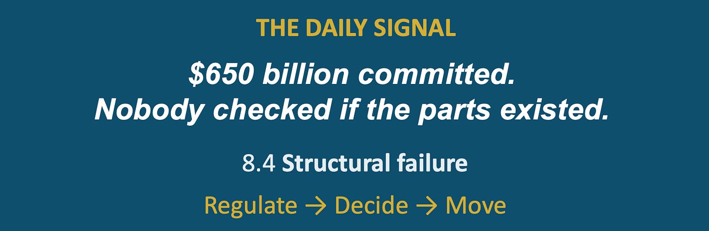 Today’s Score: 8.4 / 10 — The system is committing faster than it can physically build. The supply chain constraint predates the capital commitment by years and remains unresolved. This is not a market cycle. It is a system architecture failure.